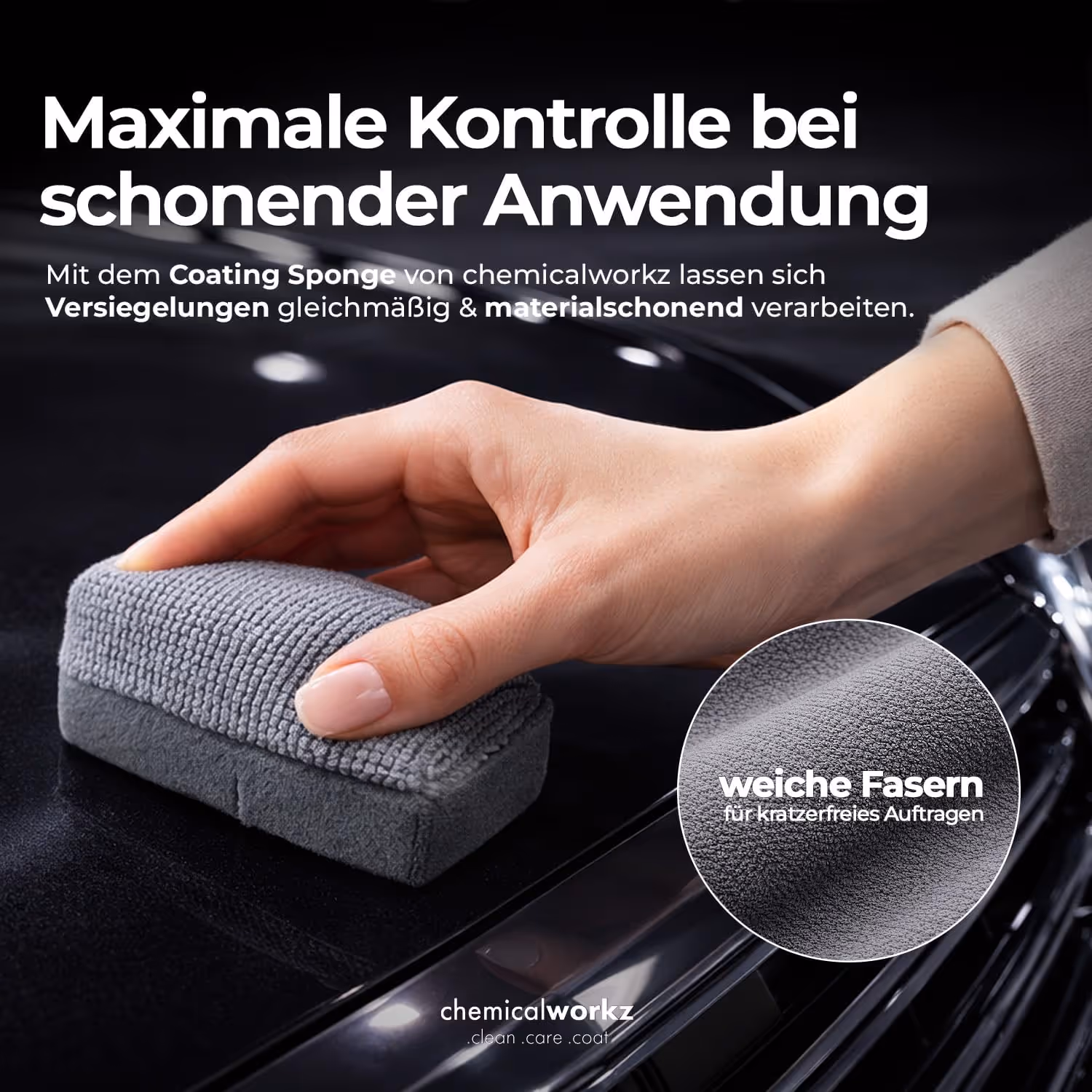 Präzises Auftragen ohne unnötigen Produktverlust: Die Coating Sponges kombinieren Mikrofaser- und Suede-Oberfläche, eine innenbeschichtete Konstruktion und eine versteckte Naht für sauberes, kontrolliertes Arbeiten auf Lack, Glas, Kunststoff und Chrom.