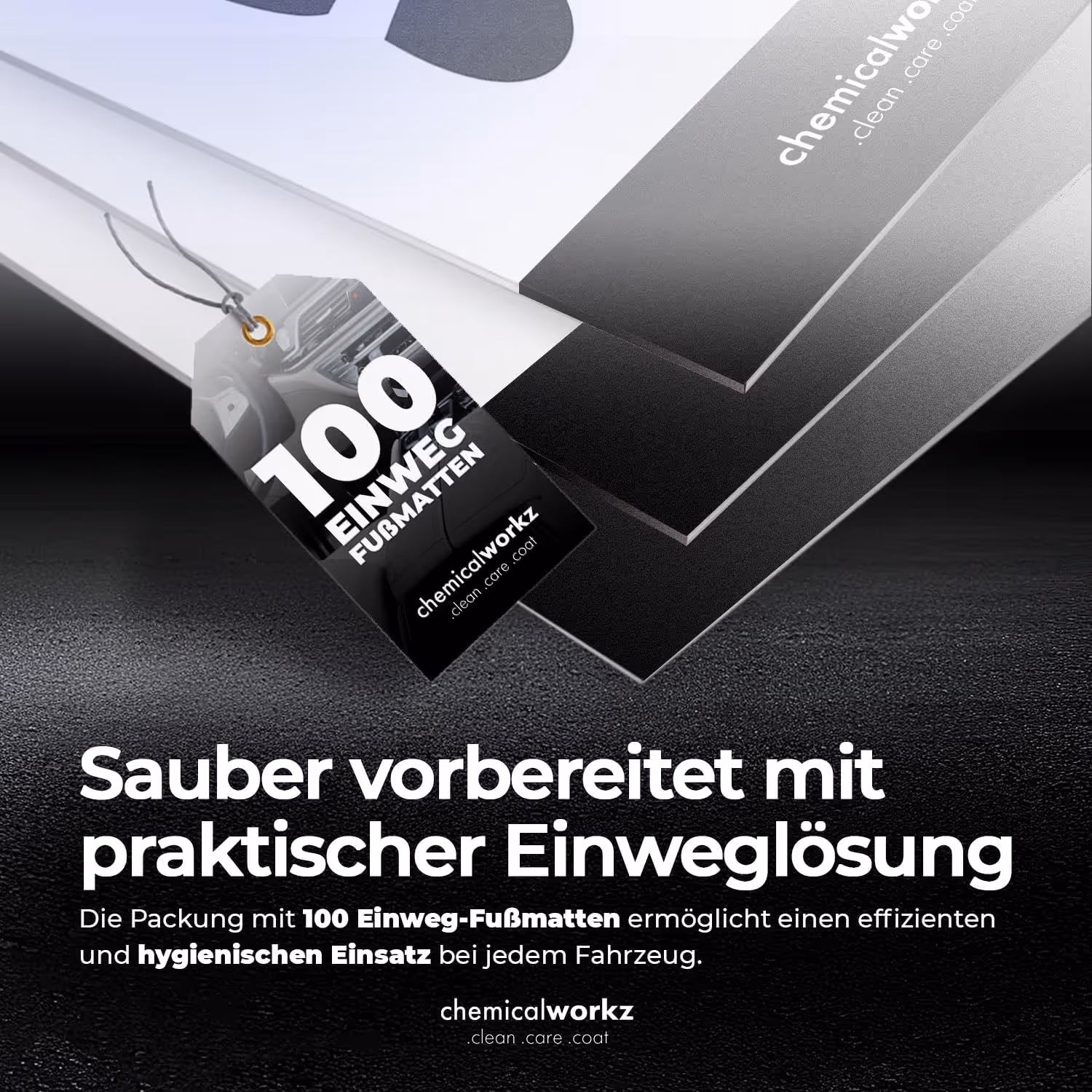 Für einen sauberen, professionellen Auftritt bei jeder Fahrzeugannahme und Übergabe. Die reißfesten Einweg-Fußmatten schützen den Innenraum zuverlässig vor Schmutz und Gebrauchsspuren.